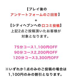 ごほうびSPAには ご新規様も、リピート様も お得にご利用できる割引がございます🈹 それが 1️⃣プレイ後のアンケートの回答🫧 ➕ 2️⃣の口コミ投稿🫧 ですっ😍🩷🩷 ![]() 最大3,300円の割引になりますので、 是非お得に遊んで頂きたいですっ😍🫶🏻 クチコミ投稿は個人的に とっても嬉しいので、、🩷 書いて下さるとつむぎが喜びますっ☺️ ご参考までに🩷 つむぎ |