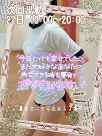 退勤しました 今日もたくさんのお兄様方に会えて とっても幸せでした ちょっぴりドキドキするハプニングがあったの💦 でも、それもいい思い出だね! 楽しかったなぁ😘 いつも私を気持ちよくしてくれて ありがとうございます お兄様との時間は本当に幸せで あっという間に時間が過ぎてしまいます 次は22日13時から出勤するよ💫 また一緒に気持ちいいことしよっ💓 お兄様に会えるのを楽しみにしてるね 私のことを忘れないでね 次回の出勤までお兄様のことが頭から離れないかも... ![]() 🔔すずな🔔 |