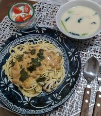 お疲れ様です🙇❣️ 旦那様はそろそろ、夜ご飯を食べる頃 ですか? もう、食べ終わってるかな? 私の昨日の夜ご飯は… たらこ納豆パスタ 長芋もずく酢 和風豆乳スープ でした。 納豆、たらこ、卵、付属のタレを あらかじめ作っておきます。 茹であがったパスタを、ニンニク、バター オリーブ、玉葱、しめじ、塩昆布、胡椒で 炒めお皿に盛り、作っておいた納豆を かけて完成です。 スープは、ベーコン、玉葱、人参、しめじ ほうれん草、水、コンソメ、味噌、胡椒。 火が通ったら最後に、豆乳を入れて 完成です。 酢の物は、糸もずくが安かったので 長芋の千切りと一緒に、かんたん酢 すりおろし生姜、ちょ~っとだけ醤油で 酢の物にしました。 映え感はないけど、前日の焦げ焦げ 画像よりはマシでしょ?www しま |