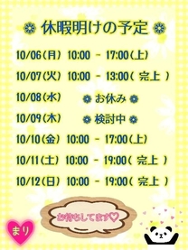 ![]() ここで 忘れない 内に 明日からの 出勤 スケジュールを お知らせ させて 頂きます ![]() ![]() ![]() まだ 検討中の 曜日も ありますが・・・ こちらは 決まり次第 改めて お知らせ させて 頂きますので ![]() 改めて 明日からの 1️⃣週間も 楽しい 1️⃣週間に なります 様に・・ ![]() ![]() 🌼 X( Twitter ) 🌼 @mari_aipotya |