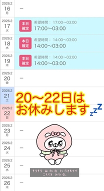 お久しぶりです♪ 毎回遅くて申し訳ありませんが シフト更新しました🙇♀️💦 今週は明日(2/17)〜2/19の 3日間で出勤いたします✨ お時間合いましたら 一緒に遊びましょうね🤗 ヨル🌙 |