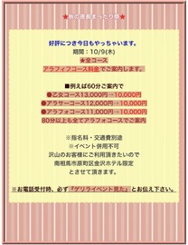 実は今日、すごーくお得なゲリライベントが決定しちゃいました✨なんと、全コースがアラフィフコースの料金でご案内できちゃうんです!つまり、乙女コースやアラサーコースを選んでも、ぜーんぶ10,000円で来れちゃうってこと🥰これは、私とゆっくり過ごすチャンスだよ!今日の夜は、いつもより長ーく、あなたのことを甘やかしたい気分なの。せっかくの秋の夜長、二人でまったり、たっぷり楽しんじゃおうね🌙予約の時に『ゲリライベント見た』って必ず伝えてね😉 |