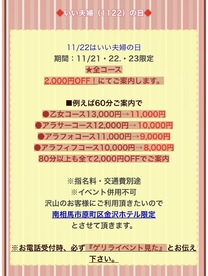 今日から3日間限定の**「いい夫婦の日」イベント**!予約時に**『ゲリライベント見た』**と伝えていただくと、全コース2000円OFF!会えるの楽しみにしてますね😊 |