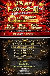 こんばんわ🐰ᩚ 3月の割引イベントのご報告🙌🏻 「トップバッター割」 キャストと一番最初に 遊べたお客様限定割引( *´艸`) 当日予約又はフリーでのご来店のお客様のみ利用可 (当日1人目かどうかの確認はお気軽にご連絡ください) 【料金一覧】 60分 ¥19.000- 90分 ¥29.000- 120分 ¥39.000- 別途指名料¥1.000- ※前日、前々日からのご予約ではご利用できません。 本指名のお客様も不可となります 画面提示が必須になります🙌🏻 でわでわ! りおん |
