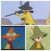 上のが昭和アニメ版のスナフキン🔫 この頃のスナフキンはなかなかぶっ飛んでて笑 ライフル銃を使いこなしたり、変装してムーミンに助言したりと、お茶目でちょっとワイルド🫣 自由気ままで、でもどこか優しさがにじみ出る感じがたまりません😳💕