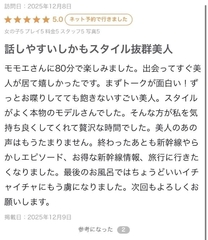 素敵な口コミありがとうございます! 80分あっという間でしたね〜… 出会ってすぐに美人って言ってもらえて、 正直ちょっと照れつつ めちゃくちゃ嬉しかったな☺️ 私が楽しそうに話せるのはお兄様になら 素を出せちゃう瞬間が沢山あったからだよ✨️ しかもモデルみたいって褒め言葉すぎます… そんなふうに感じてもらえた上で 気持ちよく過ごせた時間だったなら 何よりだよ〜!!!🫶 旅行とかどこか出かけるのが興味あるかな と思って話してみたら意外と ハマって面白かった🤣 あんな寒い中会いに来てくれてありがとう🥲 また機会見つけてぜひ 逢いに来てね🩷🩷 |