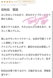 口コミありがとーう🫶 てぃなのこと可愛い!タイプって 言ってくれて嬉しい💕 お尻も褒めてくれて プレイ中のテクも絶賛してくれて るんるんさんでした🤭✨ またてぃなも秋田来るからそのときは 是非会いにきてねー!! てぃな👑✨ |