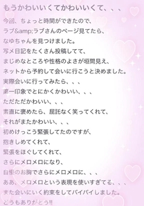 papi1020様へ❤ なゆの口コミを書いて頂きありがとうございます🥰 そして口コミお礼、並びに遊んでくれた時のお礼💌が 今の時期のタイミングもあって大変遅くなって本当にごめんなさい😭🙏💦 忘れてないよ。ちゃんと書くからね😘❤️ はじめましてで会った時から、 たくさんたくさん、かわいいかわいいって言ってくれてありがとう☺️💓 とってもとっても緊張しているのが伝わったから 思わずぎゅってしちゃった( *´꒳`)エヘ なゆの写メ日記やプロフィールもしっかり見ててくれたの 嬉しかったよ〜🫶 改めてありがとね💕︎ |