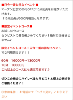 👑只今一番お得なイベント👑 オープン記念3000円OFFか10分延長をお選びいただけます。(15分延長が5000円相当) 10分延長の方がお得だよ〜🉐 濃ゆいとあっという間だと思わない? 一緒に非日常的時間を過ごしましょう🔞 👑ネット予約のオススメ👑 WEB予約でご予約確定して頂くと、必ず《10分延長》が付きます。 こちらもとてもオススメ🌈 |