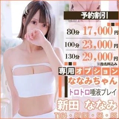 メッセージ:【唾液垂らしがエロい】 【ビチャビチャになるユーザー続出‼!】 【柔らかすぎるおっぱいも最高】 本人より... ななみの必殺唾液びちゃびちゃフ〇ラで いっぱいお〇ん〇ん硬くしちゃうからね 長い時間舐めちゃうから楽しみにしてね✨ との意気込み十分!! 彼女のような女性は、 絶対に男性に喜ばれること間違いなし!! キスが大好き!! そして色々なことに興味津々!! キスをするだけでも興奮してしまう彼女は、 エッチなことは恥ずかしいけど... 大好きです!! と頬を赤らめながら答えてくれました!! 大きな目の整ったお顔立ちと、 そのスタイルだけでもすでに十分!! それだけではなく、 何と言っても『ななみ』さんの必殺唾液攻撃は、 お客様の息子様が感じたことの無いほどの ヌルヌル感と、生温かさを感じることが出来。 じゅるじゅる...という音は耳から離れなくなります!! 冷たいローションを体に塗るよりも、 暖かい唾液まみれにした方が、エッチだと思いませんか?? これはお呼び頂かないと体験できないので、 一見の価値が絶対にあります!! プレイ面だけではなく、 お客様史上一番を目指したい!! 彼女は常にお客様ファーストで考えることのできる、 その性格の良さもお客様にお喜び頂ける彼女の 持ち味の1つです!! ルックスも、プレイ面もどちらも ご満足いただける女性であることは 疑う余地なしでございます!! ぜひその素敵なお時間を、 ご堪能下さいませ!!