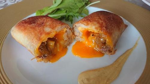 中は細切りのじゃがいも 牛肉 半熟卵 春巻きの皮二枚重ねは 包みやすいし 食べても美味しいです 切った時 黄身が溢れ出てくれるかドキドキでした ヒナタ