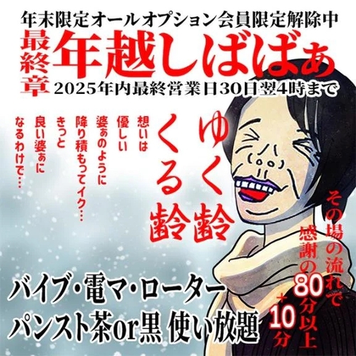 最終章は12月30日朝4時まで営業します 店休日 12月31日 1月1日 1月2日 年末まで 80分以上 +10分 会員様限定 バイブ、ローター、電マ、パンスト使い放題 (え?いつも使い放題でしょ?🤔 ということは置いといて…) きんぎょや最終章のBBAに姫納めはお任せを!