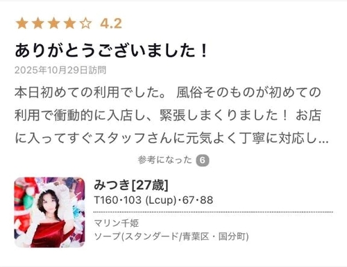 メッセージ:プレミアムキャスト!★3 +3,500円 黒髪ロングに艶やかなプロポーション。 その美貌だけでも目を引く存在「みつき」さんですが、 実際に接すると、よく笑い、明るく、親しみやすい―― そんなギャップに惹かれるお客様が後を絶ちません。 彼女の魅力は見た目だけにとどまらず、 接客中の“気配り”や“空気の読み方”も抜群。 丁寧で誠実、それでいてどこか余裕のあるその立ち振る舞いは、 多くの方から「居心地が良かった」と高評価をいただいています。 「また会いたい」と自然に思わせる、 そんな“サービス満足度の高い接客”が、 彼女を本指名へと導いている大きな理由です。