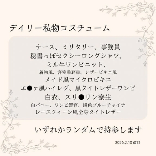 用意しています ✨️ 私物コスプレとなる場は、日替わりのランダムコスプレでの対応になりますが、シフト提出後、お早めに仰っていただけたらリクエストにも お応えしたいと思っております ☺️ リクエストの際はオキニトークまたは個人SNSのDMをご活用下さい♡