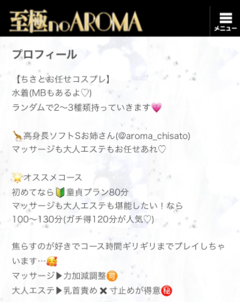 常に笑顔で皆様の心を癒してくれる清楚系美人セラピストの入店です。 落ち着いた大人の気品溢れる雰囲気と太陽のような明るい性格、ちさとさんだからこそ共存するこの二点。誰もがその魅力に惹かれることでしょう。 対面前の緊張がまるでなかったかのように、出会った瞬間から打ち解け、しっとりとそれでいて心躍る空間になること間違いありません。 男性に尽くすことが喜びという献身的な一面もあり、男冥利に尽きる。そう感じさせるお時間がお待ちしております。 【舞い踊るハイスペック美女。妖艶なテクニックで貴方を導く】 経験を感じさせるマッサージ技術も素晴らしく、気持ち良さから思わず唸ってしまう力強いマッサージで、全身が軽く若返ったような感覚に。ですが彼女の真骨頂はここから。 妖艶な手つきで貴方の感じるポイントをあっという間に的確に掴み、快感の波は一気に最高潮。乳首責めから鼠径部リンパまで、全身リップといやらしいハンドテクで焦らしに焦らされ、至極の絶頂まで導かせていただきます♪