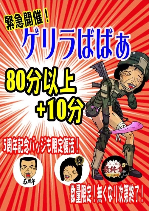 緊急開催!ゲリラばばぁ 80分以降で+10分サービスなわけで! 5周年記念缶バッジも限定復活☆ こちら数量限定! 無くなり次第終了なわけで🙇 お電話にて「ゲリラばばぁ」とお伝えいただければ 本日中どなたでもお付けするわけで!
