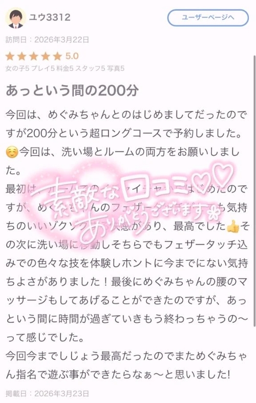 メッセージ:本格的な癒しと濃厚サービスのご案内です!! テクニシャンな魔術師こと【メグミ】ちゃんのご入店です!!! まず、目に留まるのは本格的なマッサージ!!! まさに最高級な癒しではありませんか!! 性格の方も本当に可愛らしくて 人懐っこく愛嬌満点!! そんな彼女の特技がなんと!! 是非紳士的なお兄様方のご指名をお待ちしておりますので、宜しくお願い致しますm(__)m