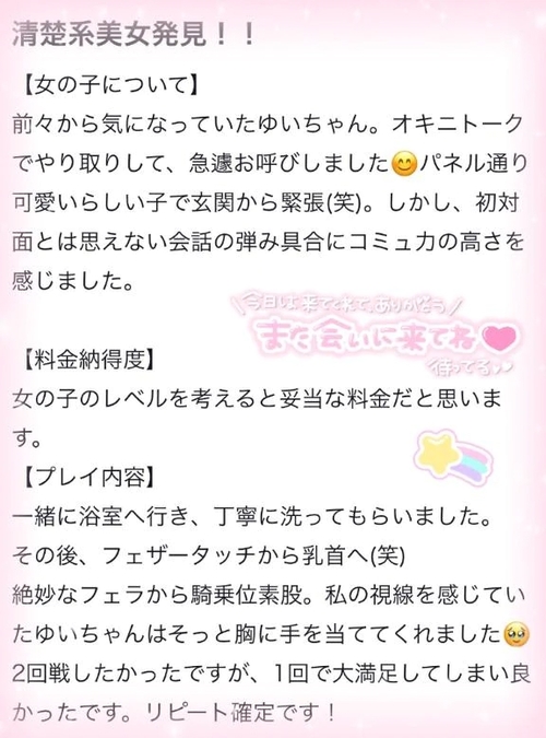 【可能オプションは?】 ローター(1,000円) パンスト(1,000円) アイマスク(1,000円) 手錠(1,000円) 写メ撮影顔出しなし3枚(2,000円) デンマ(2,000円) パンツお持ち帰り(2,000円) オナニー鑑賞(2,000円) 撮影(局部のみ)(2,000円) 即尺(2,000円) ローション風呂(90分以上)(2,000円) 写メ撮影顔出しあり3枚(3,000) コスプレ(3,000円) 聖水(3,000円) バイブ(4,000円) 顔出しあり(10,000円) ゆいちゃんのPOINT♪ 甘酸っぱいアオハルを取り戻そう! 清楚♡妹系の美少女♡ ルックス・スタイル・スケベさ最高潮!!! 性格の良さが滲みだし、愛嬌抜群の好印象♡ 美白の曲線美が織りなす官能的なボディラインに 興奮が止まりません!! はにかむ笑顔に心奪われ、気が付けば沼♡ 後悔したくない先生方の背中を後押し!! 間違いなくオススメです♡ ご予約殺到が見込まれますので お早目にお問合せください! ※ねむさんとの3P可能