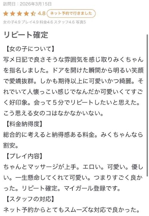 かなり自信をもっておすすめできるセラピストです。 綺麗系のルックスに加え、愛嬌があり話しやすさも抜群です。 自然と距離を縮めるのが上手で、気づけば心も身体も委ねてしまうような魅力があります。 初めての方はもちろん、リピートしたくなる理由がすぐに分かるはずです。 【癒しも色気も技術も揃ったおすすめセラピスト!】 しっかりとしたエステ経験があり、マッサージ技術も非常に高く、身体の芯から癒されるのを実感していただけます。 みくさんと最高の至福の時間をいってらっしゃい★ 超絶プレミア出勤となりますので、是非ご利用はお早目をお勧めいたします!