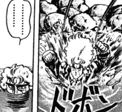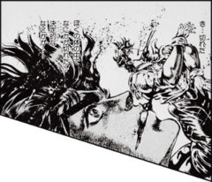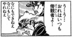 ディオの肘と膝を顔面に受けるも、掴みかかって頭突きを喰らわせた事でディオの動きが止まり、それを皮切りにジョナサンは怒りに任せながらディオを、今日までの恨みも兼ねて、一方的かつ徹底的にボコボコにする