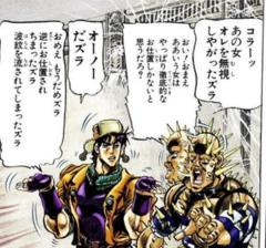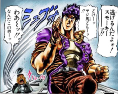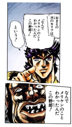 相手の台詞を相手がいう前に言い当てるという、主人公ジョセフのキャラクターを強烈に印象付けるやり取りとなっている