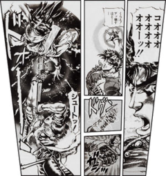 エシディシの左腕を切断することに成功したジョセフは、彼の怒りを誘うべく切り落とした左腕をこれ見よがしに波紋で蒸発させる