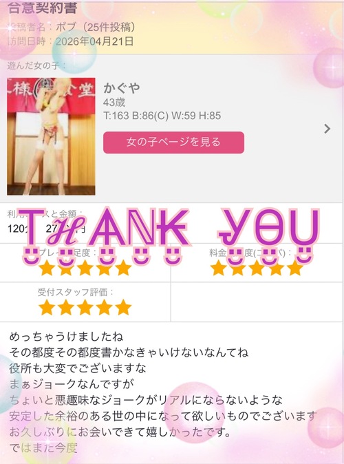 メッセージ:スレンダーボディのかぐや奥様、何と言ってもⅯ男君・・・Ⅿな男性が大好きなんです! 優しくじわじわといじめられるドキドキ感!ぜひ味わって下さい!! ★オススメコース★ 《かぐ姉さんの攻め攻めコース》【80分以上ご利用で遊べます】 ボンテージ、セクシーランジェリーに身を包んだかぐや奥様がアイマスク&手枷をした 貴方をエロく優しく、時には激しく攻めちゃいます! 《女教師かぐやのイメクラコース》【80分以上ご利用で遊べます】 恥ずかしさなんて脱ぎ捨てて生徒になりきるのがポイントですよ♪ 攻め攻めコース、女教師コース共に80分以上のご利用で無料でご利用出来ます。 お電話の際、スタッフにお申し付け下さい。 Ⅿでは無いお客様もいつもとは違うプレイを楽しんでみてはいかがでしょう! 痴女コースを楽しみながらマットプレイのフルコースなんて1度ご利用いただければ ハマること間違いなしです!! ※マットプレイはおススメのホテルでの利用になります。 ※80分以上のご利用で+1000円でマットプレイが利用できます。 スレンダーボディのかぐや奥様、何と言ってもⅯ男君・・・Ⅿな男性が大好きなんです! 優しくじわじわといじめられるドキドキ感!ぜひ味わって下さい!! ★ 奥様のおすすめトッピング 無料トッピング 即尺 有料トッピング マットプレイ(1,000円) ※オススメのホテルにて80分以上ご利用のお客様に限ります。 ★ 無料トッピング トッピング01 コスプレ (セクシーランジェリ、ボンテージ、個人イベント用コスチューム) トッピング02 生パンティ無料 トッピング03 パンスト破り トッピング04 ノーパン・ノーブラ訪問 トッピング06 下着訪問 トッピング07 ホテル内即尺 トッピング08 バイブ使い放題 トッピング09 パンコキ トッピング10 パンストコキ トッピング14 顔面騎乗 トッピング15 アイマスク トッピング16 ローター使い放題 ★ 梅トッピング(1,000円) トッピング05 聖水 トッピング13 電マ使い放題 トッピング21 とことんアナル舐め トッピング22 待ち合わせ トッピング23 ソフトSM トッピング24 オナニー鑑賞 ★ 竹トッピング(2,000円) トッピング19 イラマチオ