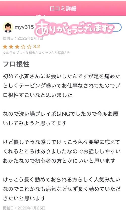 忘れずに口コミお寄せくださって ありがとうございます🥰 膝のケガでサービスが十分できずに 申し訳ありませんでした🙏 今は回復して元気な状態なので またいらしてくださいね♥️ もちろん、お風呂場でも♥️ 楽しみにしております✨ マキシム 小斎 (こさい)