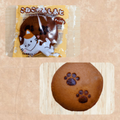 『こねこのあしあと』という名前の商品で小さいチョコどら焼きで猫の足跡が付いていてとっても可愛いの🐾