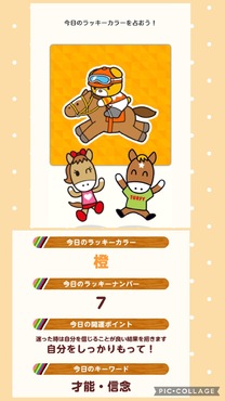 今日競馬する前にターフィーのサイトでラッキーカラーのコンテンツがあったので占ってみたら橙が出てきて(*^^*)高松宮記念重賞レースの私が選んだ2位と3位がオレンジ色の枠だった事にあとで気づきました(*^^*)