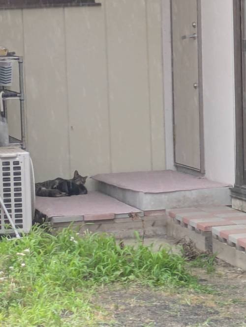 かわいい猫の親子が玄関で雨宿りを
