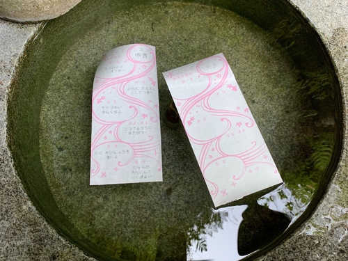 水みくじといって、水に浮かべると文字が浮かびあがるというおみくじです、アドバイスも書かれていたので実践あるのみ☺️