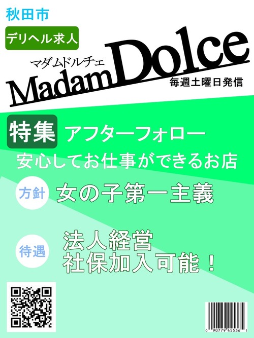 メッセージ:皆様、こんにちは。マダムDOLCEの女性店長兼オーナーです。 私が求人担当をメインで行っています。 日々配信される内容は、自動更新で毎日配信していますが、 内容は私と専務で精査した上で、更新しております。 主に、私、店長が電話受け、財務管理、求人全般を行い、 専務がサイト管理、法務関係など内勤業務、レタッチや、コーディング、広告画像作成などPCでの作業をメインに業務を行っております。 基本的には、女の子の対応は私、店長が対応しておりますのでご安心ください。 求人に関するご質問などあれば、どうぞお気軽にお問合せ下さい。