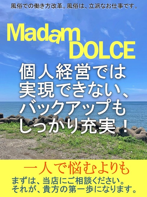メッセージ:皆様、こんにちは。マダムDOLCEの女性店長兼オーナーです。 私が求人担当をメインで行っています。 日々配信される内容は、自動更新で毎日配信していますが、 内容は私と専務で精査した上で、更新しております。 主に、私、店長が電話受け、財務管理、求人全般を行い、 専務がサイト管理、法務関係など内勤業務、レタッチや、コーディング、広告画像作成などPCでの作業をメインに業務を行っております。 基本的には、女の子の対応は私、店長が対応しておりますのでご安心ください。 求人に関するご質問などあれば、どうぞお気軽にお問合せ下さい。