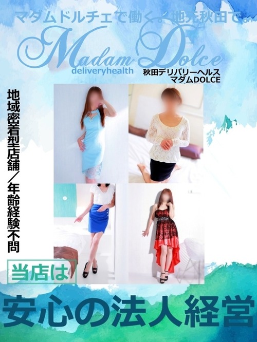 メッセージ:皆様、こんにちは。マダムDOLCEの女性店長兼オーナーです。 私が求人担当をメインで行っています。 日々配信される内容は、自動更新で毎日配信していますが、 内容は私と専務で精査した上で、更新しております。 主に、私、店長が電話受け、財務管理、求人全般を行い、 専務がサイト管理、法務関係など内勤業務、レタッチや、コーディング、広告画像作成などPCでの作業をメインに業務を行っております。 基本的には、女の子の対応は私、店長が対応しておりますのでご安心ください。 求人に関するご質問などあれば、どうぞお気軽にお問合せ下さい。