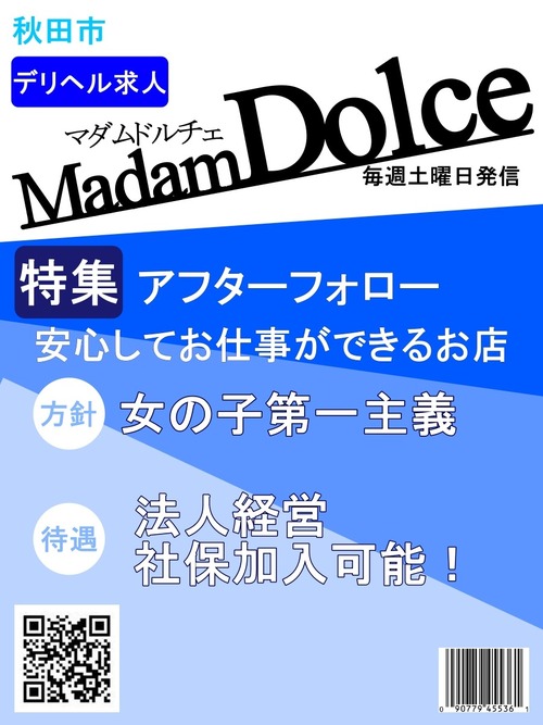メッセージ:皆様、こんにちは。マダムDOLCEの女性店長兼オーナーです。 私が求人担当をメインで行っています。 日々配信される内容は、自動更新で毎日配信していますが、 内容は私と専務で精査した上で、更新しております。 主に、私、店長が電話受け、財務管理、求人全般を行い、 専務がサイト管理、法務関係など内勤業務、レタッチや、コーディング、広告画像作成などPCでの作業をメインに業務を行っております。 基本的には、女の子の対応は私、店長が対応しておりますのでご安心ください。 求人に関するご質問などあれば、どうぞお気軽にお問合せ下さい。