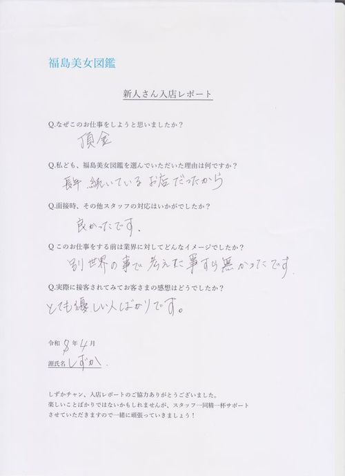 当店、福島美女図鑑に入店を検討されている女性の方は是非参考にしていただき、またお客様は『しずかチャン』の人柄により触れられたかと存じます。