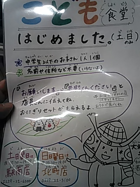 毎週土曜日に駅南店、日曜日に北町店で、17時30分~19時30分の間に行くと、おにぎりとから揚げのお弁当が貰えます。