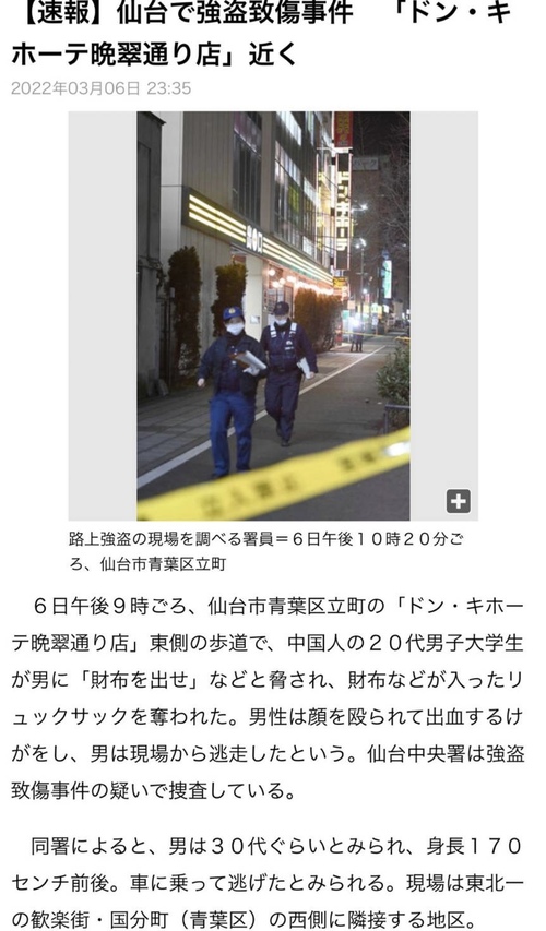 30代男性が、20代中国人男性を殴りバッグや財布などを取り逃げた事件らしいです!