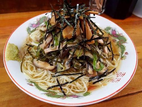 夏限定の冷やしラーメン、少し酸味の効いたスープは暑い夏には食べやすくピッタリかなと思いますし、具の切り昆布?と干しエビがいいアクセントになってます。