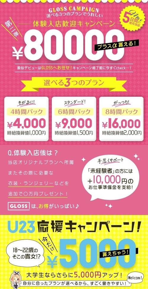 メッセージ:在籍中はスタッフ一同できる限りのサポートをして、より良い環境作りを致しますので何でもご相談してくださいね♪ 当店があなたにとって『最適な居場所』の一つになると断言します! 新たな未来へ向けて、その一歩を踏み出すあなたからのお問い合わせを心よりお待ちしております。 共に頑張りましょう!! ここから夢や目標に向かってのスタートです♪