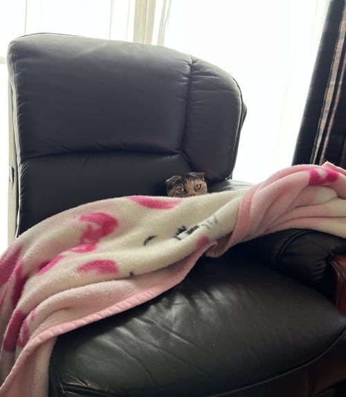 毛布の陰からまゆこを見ている